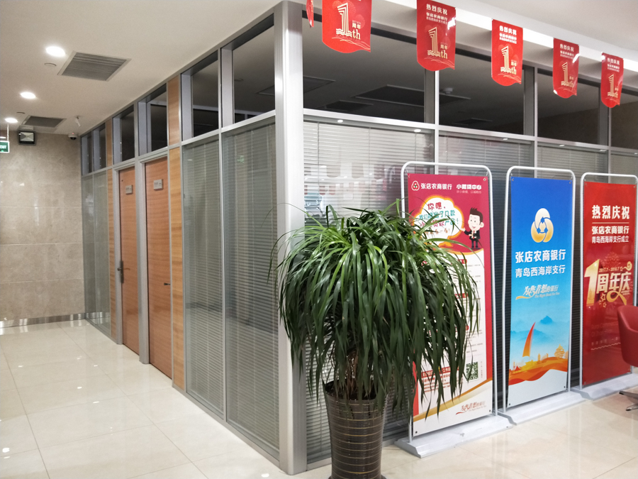 青島農(nóng)商銀行項目:HX-85款氟碳噴涂中古銅色單層10mm、雙層5mm鋼化玻璃隔斷,防彈旋轉(zhuǎn)門、自動門等,隔斷施工面積3000平方以上,先后為青島農(nóng)商銀行多個分支機構(gòu)提供服務,并建立長期的合作關(guān)系。