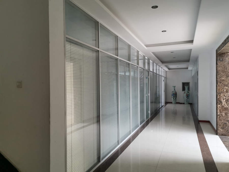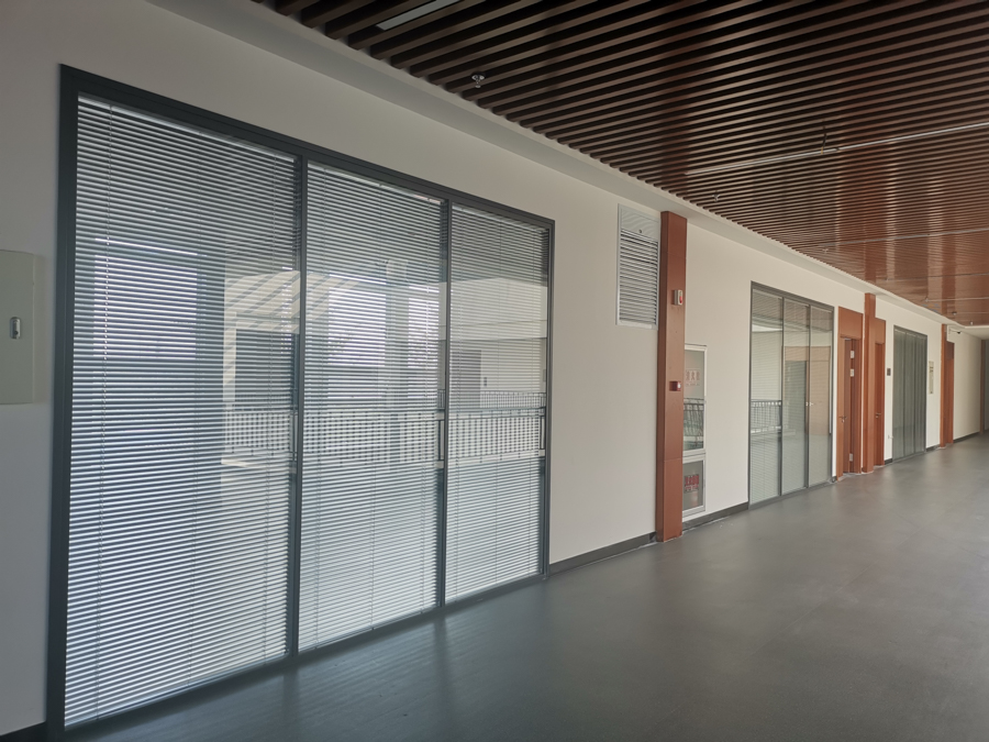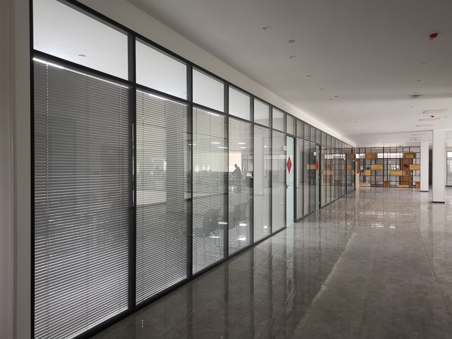 海爾空調(diào)水機(jī)項目:HX-85款氧化銀色,雙層5mm鋼化玻璃內(nèi)置百葉隔斷,隔斷配套12mm鋼化玻璃門扇。電梯廳自動門系統(tǒng)采用松下自動門及門禁系統(tǒng)。